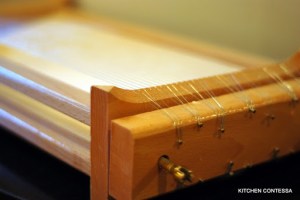 A chitarra (pronounced key-tahr-rah and translated to mean guitar) is a wooden box, with wire guitar like strings, which are secured from end to end. It is believed that the chitarra was invented in Abruzzi Italy around the 1800’s. My chitarra was brought all the way from L’Aquila, Italy, by a friend. It is an amazingly simple invention of pure genius! Sheets of fresh macaroni are laid across the top of the strings and rolled with a rolling pin. The strings cut through the dough and perfect strands of linguini fall to the bottom of the box. You tilt the box and the cut macaroni drops onto your table top! It is so easy and perfect if you are craving a bowl of homemade macaroni without having to attach anything to the counter or your Kitchen Aid mixer. It is also very fascinating for kids to watch and safe enough for them to help.