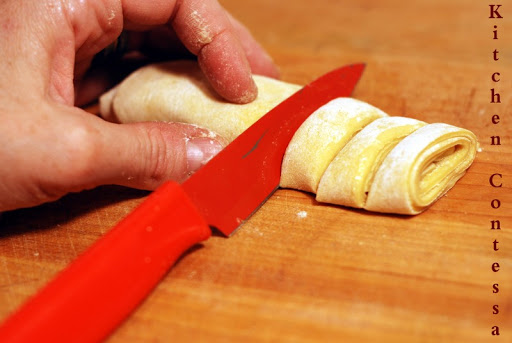 From there you take a knife and cut strips as thick or thin as you would like. If you want Pappardelle then cut the strips wide. If you want Spaghetti than do your best to cut the strips thin. Once your strips are cut then unroll them and give them a good flouring. Be careful to not pile them because they might stick. I always have a floured sheet pan close by and as I unroll I flour and lay them out giving them lots of space on the tray.