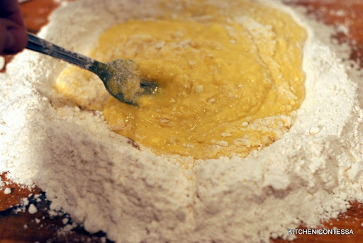 I used just plain old unbleached flour, but you could substitute semolina. I made the well big enough to accomodate the 4 eggs in the recipe. I held my breath because I thought it would over flow, but I just used my fork to push the flour back and the last egg fit into the well. I scrambled the eggs with my fork and then gradually started to pull in the flour from my well walls.