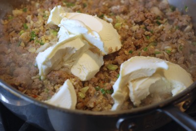 When the meat is brown add the mushroom stems and garlic. Cook until tender 4 minutes. Add the scallions, bread crumbs and mascarpone cheese. Stir gently until mascarpone melts. Take off the heat and add the Asiago cheese.