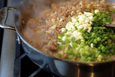 When the meat is brown add the mushroom stems and garlic. Cook until tender 4 minutes. Add the scallions, bread crumbs and mascarpone cheese. Stir gently until mascarpone melts. Take off the heat and add the Asiago cheese.