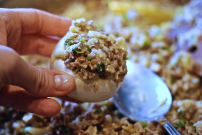 I found these big beautiful babies at the market last week. They were huge. Start by removing just the stems. Don’t scoop any of the meat out of the mushroom.