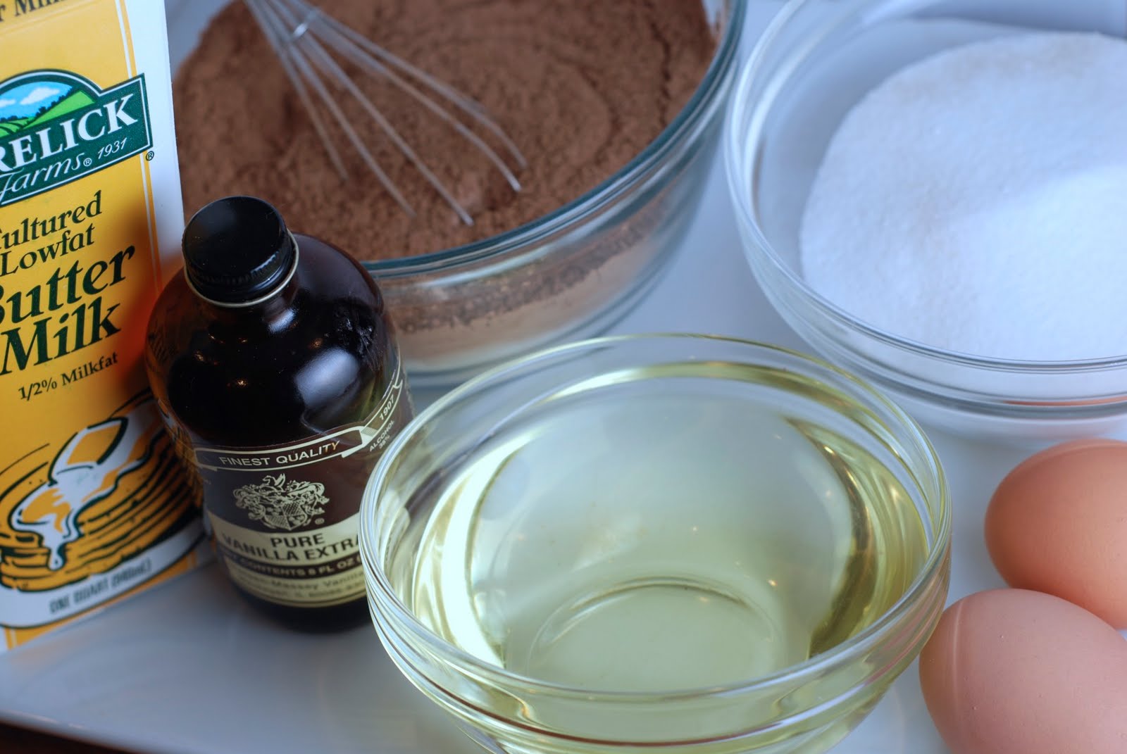 In another mixing bowl with a hand beater or in the bowl of a stand mixer beat eggs, sugar canola oil, vinegar, and vanilla until light and fluffy about 2 minutes. Gradually add flour mixture and mix until incorporated. Add buttermilk and food coloring.