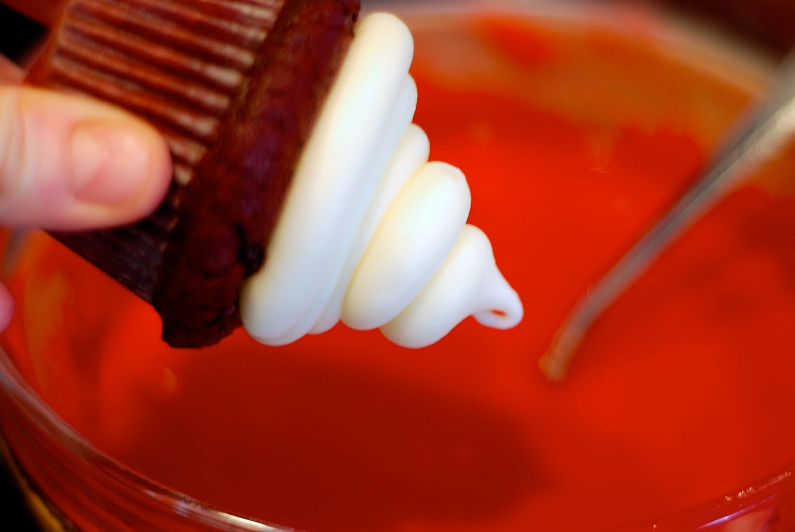 You have a choice with the frosting. You could color the frosting red and pipe in on or you can do what I did and that is to give the frosting a very thin coat of red chocolate. I used the colored chocolate wafers. I melted it over a double boiler and then dipped the frosted cupcakes into the chocolate.