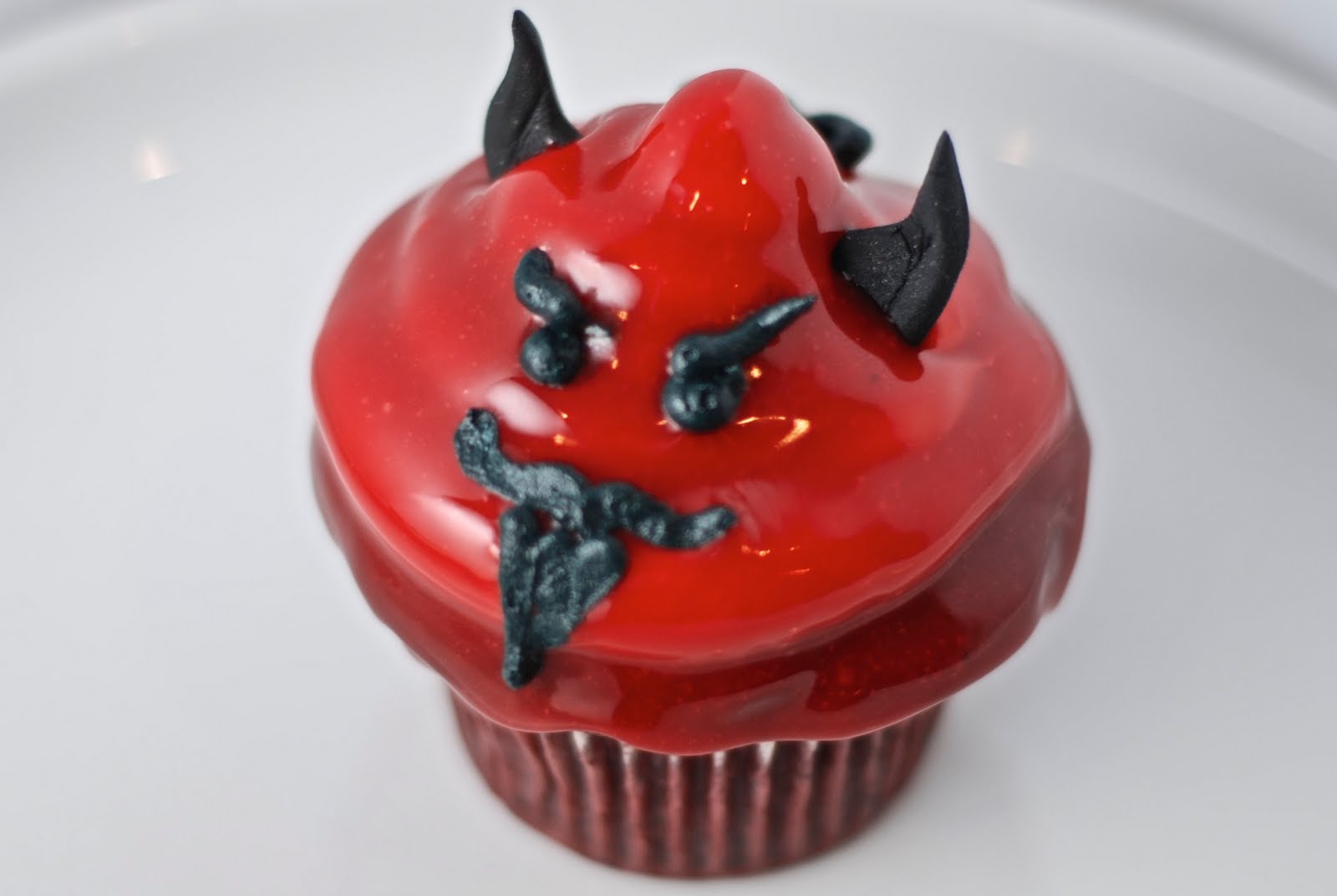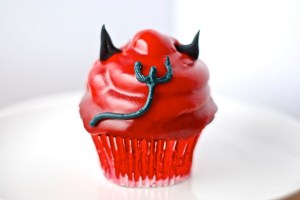 Then you just stick the horns into the cupcake and use a little royal icing to complete the eyes and pitch fork tail!