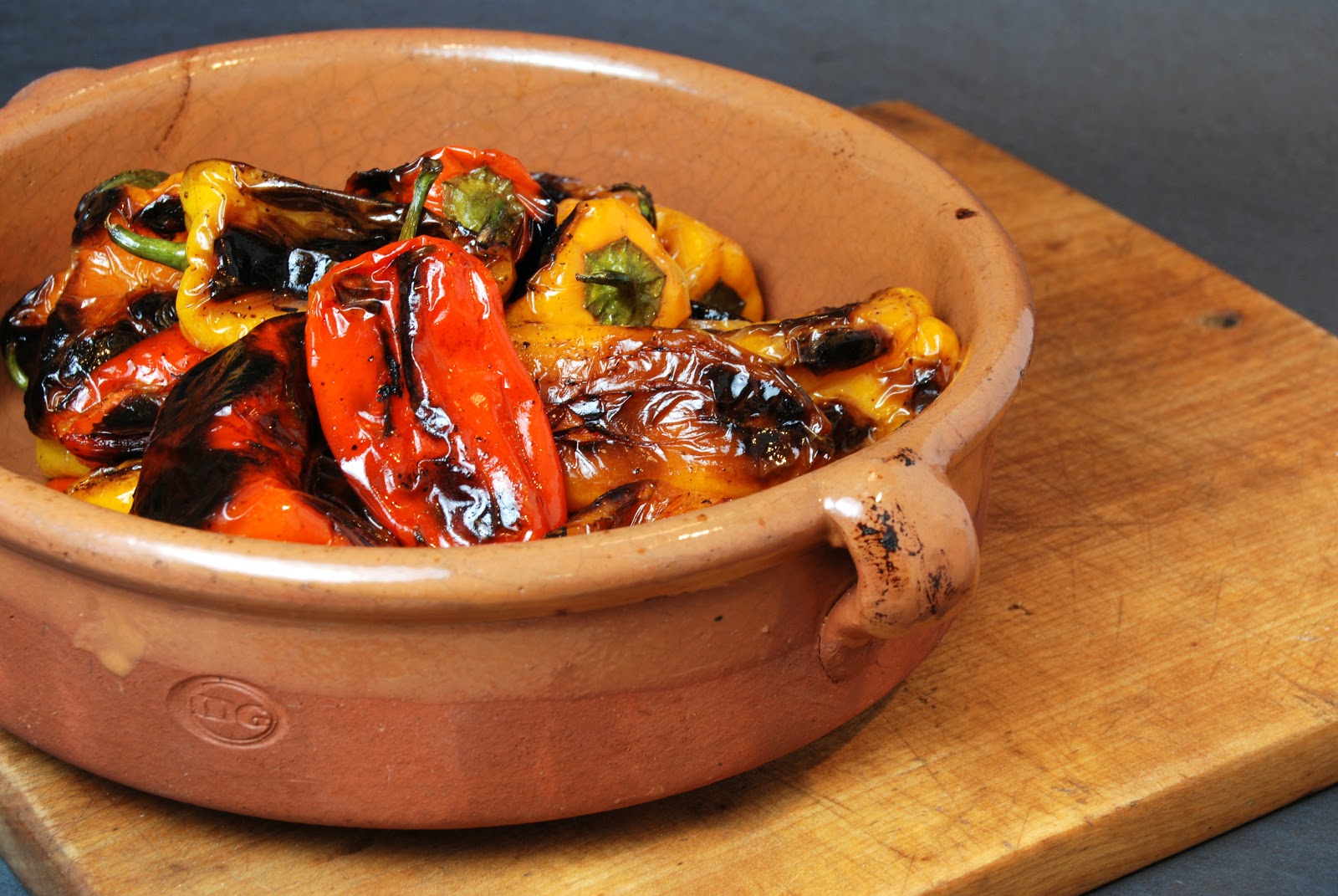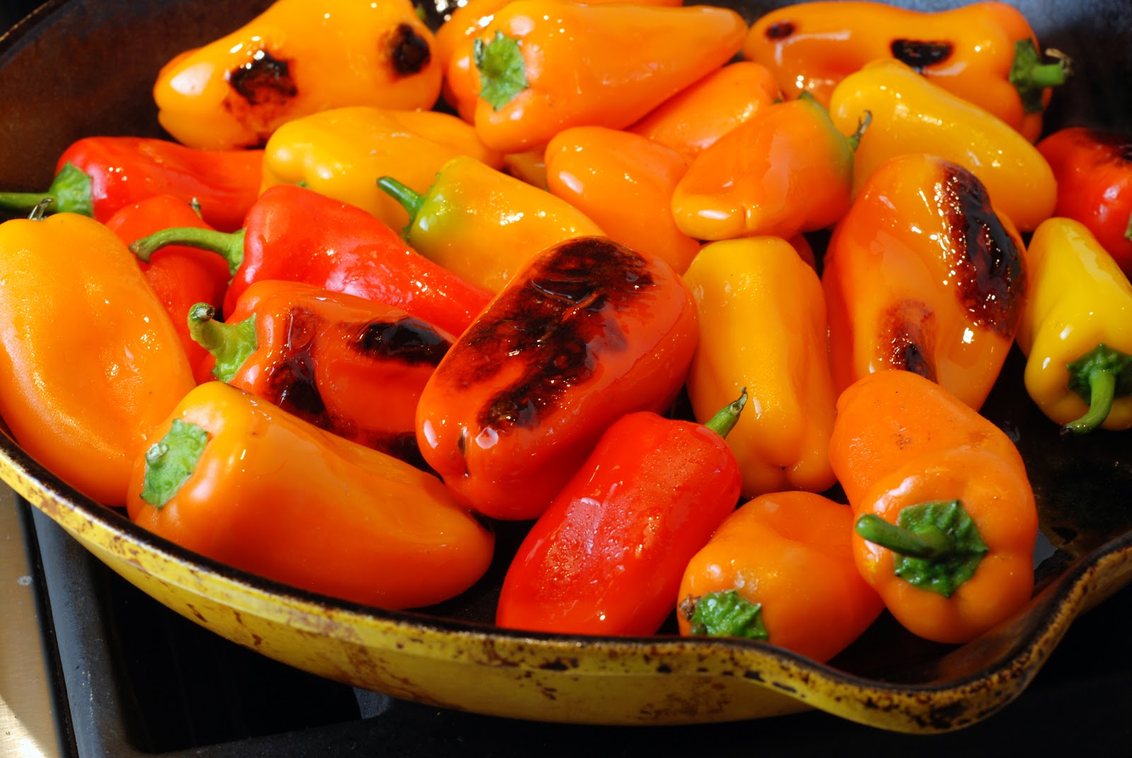 She didn’t touch them.  I kept asking her if she was going to stir. She kept saying “NO”. After about 6-7 minutes she stirred and it was amazing. The peppers were charred like they had been directly over the flame. She lowered the flame once they all had a nice even char and let them cook through. When they were nice and tender she added sicilian black olives. The heat of the skillet plumped up the olives and then she turned off the flame.