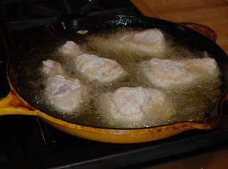 5. When oil has reached 350 degrees using tongs start placing dredged chicken, skin side down, into pan. OIL TEMP WILL DROP AS YOU ADD CHICKEN. DO NOT LET OIL TEMP DROP BELOW 325 DEGREES. REGULATE HEAT BY TURNING FLAME UP OR GIVE OIL CHANCE TO COME BACK UP BEFORE PLACING NEXT PIECE IN OIL.