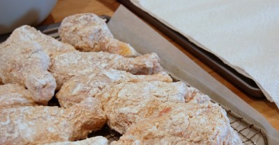 2. Using remaining flour in bowl, lightly dredge chicken pieces (shake off all excess) and immediately place into bowl of buttermilk. Cover and refrigerate for 3 hours.