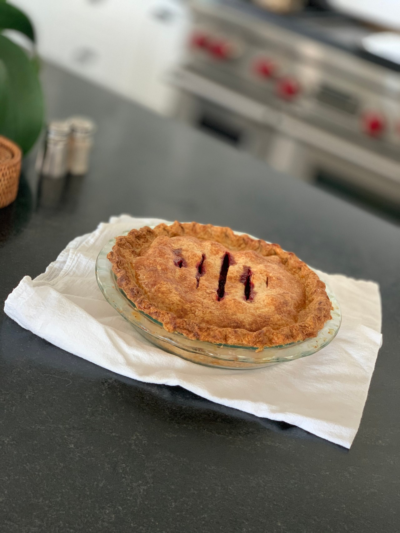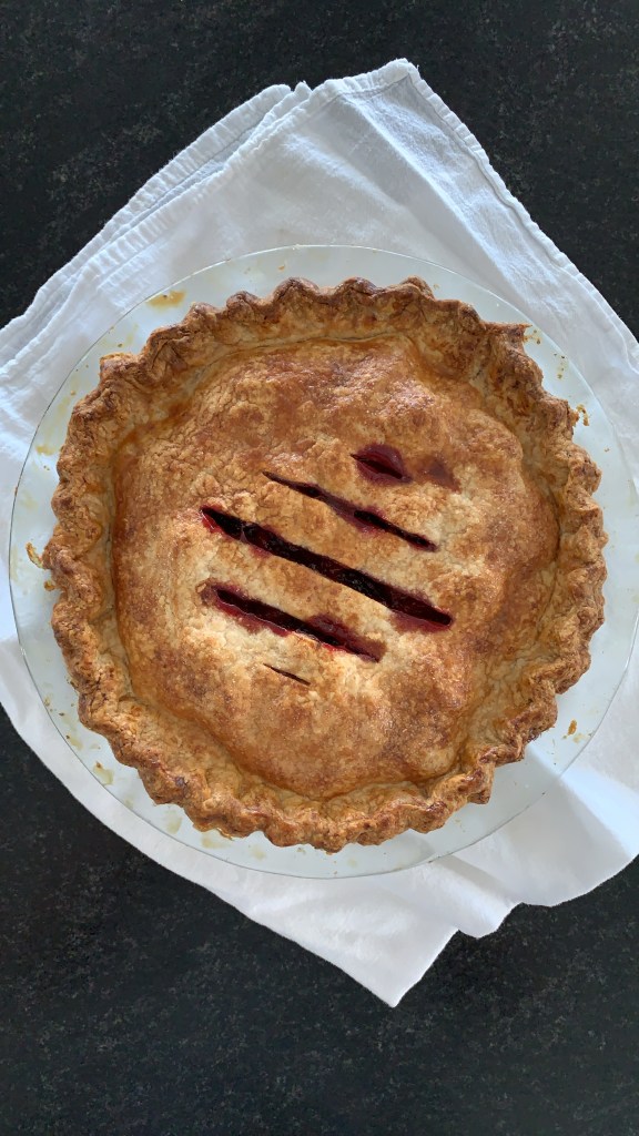 I bake my pies at 350 for 1-11/2 hours to insure bottom cooks nicely and top is really deep golden brown.